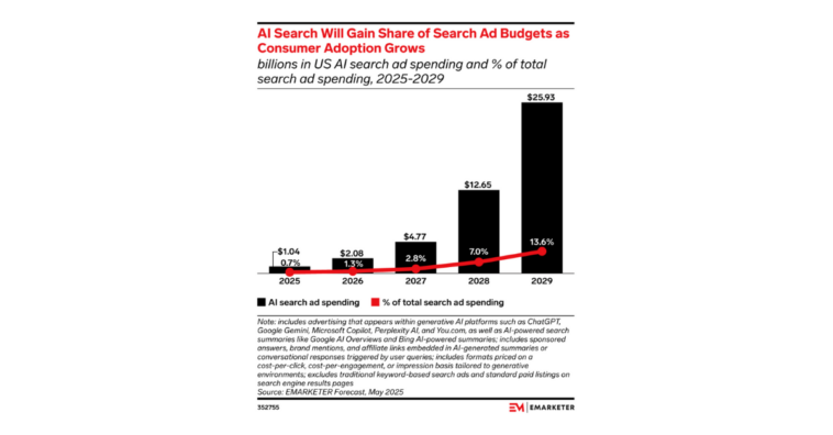 According to fresh forecasts from eMarketer, AI-driven search ad spending in the US will skyrocket from just over $1 billion this year to nearly $26 billion by 2029, capturing 13.6% of total search ad budgets — a massive leap from its current share of under 1%.