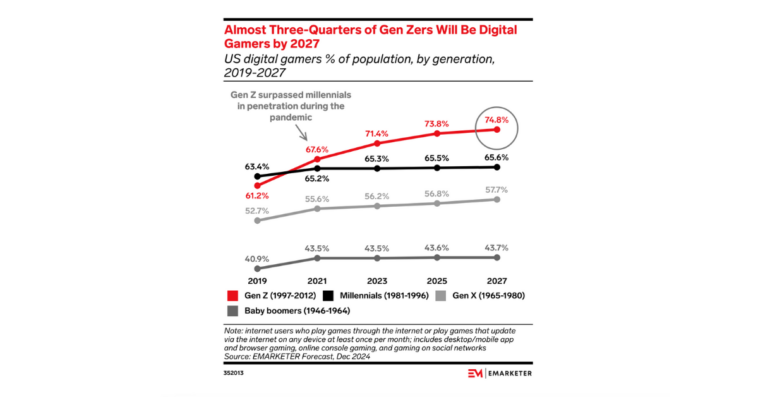 The influence of digital gaming continues to surge among younger generations, with a new forecast revealing that nearly three-fourths of Generation Z in the United States will be active digital game players by 2027. According to eMarketer projections from December 2024, a staggering 74.8% of Gen Zers will engage in gaming within the next two years, reinforcing the generation’s deep-rooted connection to interactive entertainment.