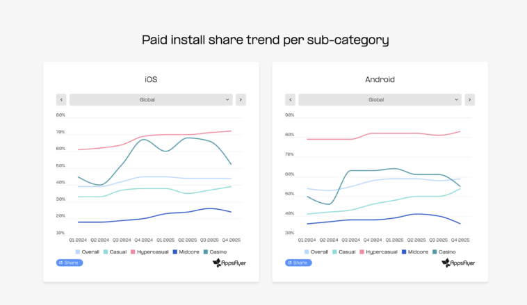 Paid acquisition patterns varied significantly by genre. Hypercasual games remained heavily reliant on paid traffic, with paid installs accounting for 81% of Android installs and 67% on iOS. Casual games saw an 18% increase in paid install share on Android, while Midcore titles recorded more than 30% year-over-year growth on iOS.