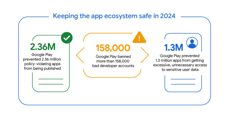 Google intensified its security measures in 2024 to safeguard the Android ecosystem, blocking more than 2.36 million policy-violating apps and banning 158,000 developer accounts. The company also restricted 1.3 million apps from accessing sensitive user data and enhanced its scanning technology to detect potentially harmful applications.