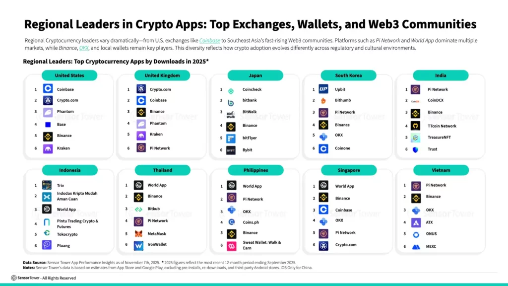 The cryptocurrency landscape reflects even more variation. Coinbase leads adoption in the U.S., while Southeast Asian markets show rapid momentum around Web3 communities and lightweight mobile wallets. Binance, OKX, Pi Network, and World App remain central players across a wide range of markets, reflecting evolving attitudes toward digital assets and differing regulatory environments.