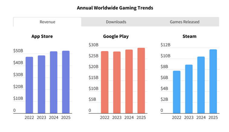 Despite leading in revenue, Apple’s platform saw 7.8 billion game downloads, a 5.7% year-over-year decline. Google Play, which continues to dominate in volume, recorded 42.4 billion downloads, down 7.3%. By contrast, Steam downloads rose 6% to 857 million, reflecting stronger momentum in the PC segment.