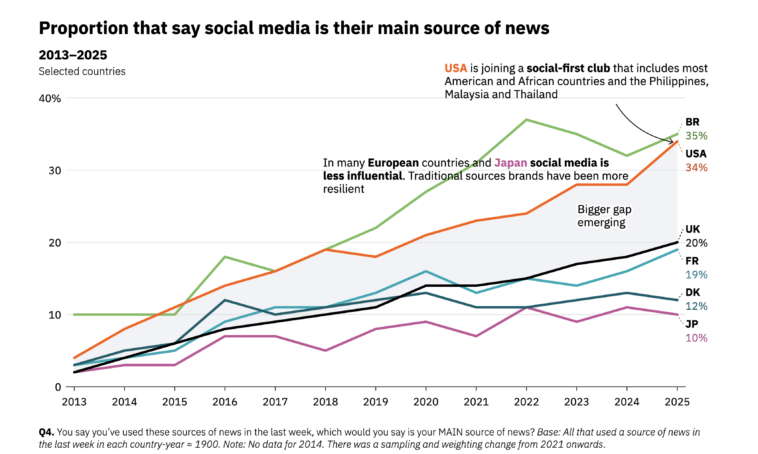 For the first time, more Americans now get their news from social media than from television, marking a watershed moment in global media consumption. According to the 2025 Digital News Report by the Reuters Institute, 54% of U.S. adults rely on social and video platforms for news, overtaking TV (50%) and traditional news websites or apps (48%).