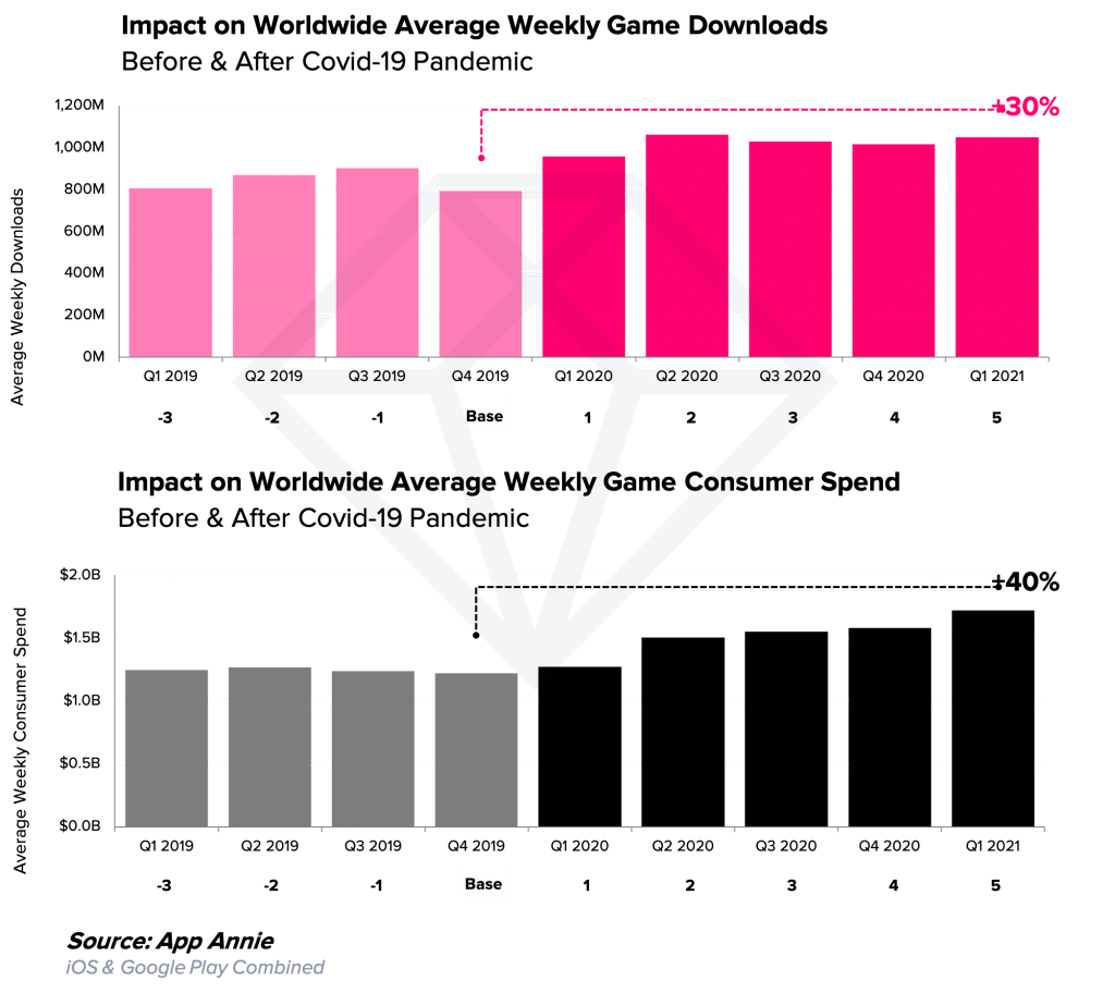 In addition, weekly global consumer spending in mobile games on Play Store and App Store surpassed $1.7 billion in Q1 2021. That’s 40% higher than the pre-pandemic levels.