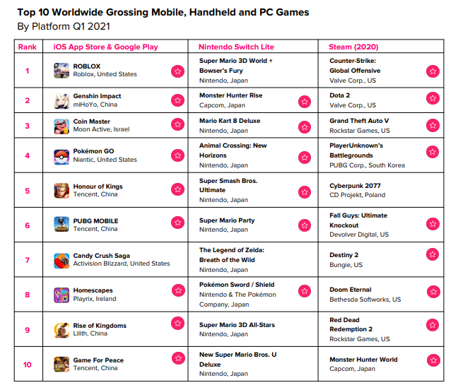On mobile, Roblox was the No.1 top-grossing title in the first quarter of 2021, followed by Genshin Impact and Coin Master. The Top 10 list includes Pokemon Go, Honour of Kings, PUBG Mobile, Candy Crush Saga, Homescapes, Rise of Kingdoms and Game for Peace.