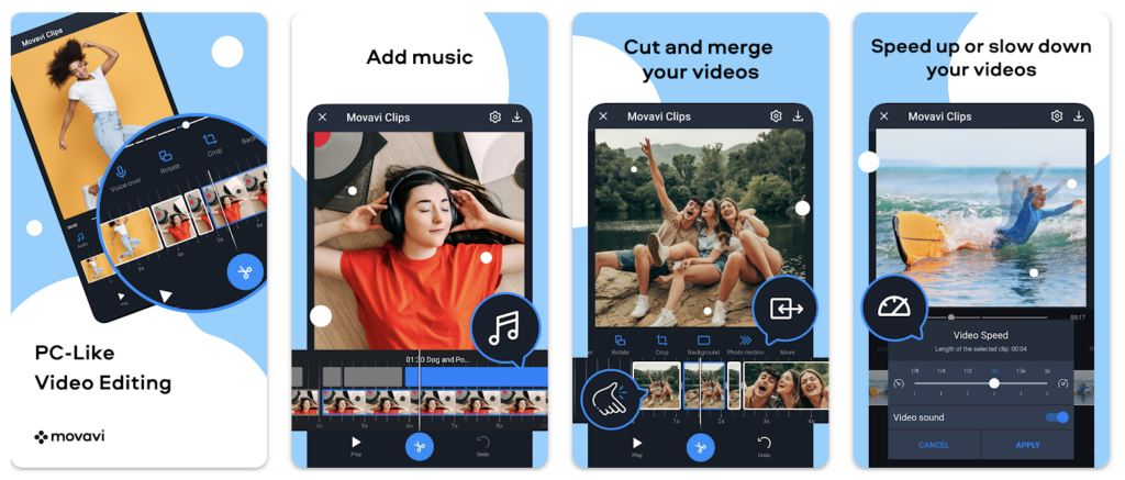 Movavi Clips Edit Video Editor is a magnificent 4K video editing app on Google Play that offers an easy-to-use interface and powerful features. The app provides quick and precise cutting, allowing you to split, merge, and remove unwanted sections effortlessly. Users can enhance their videos with color filters, transitions, stickers, and text overlays. The app includes a built-in library and photos. Thus, users can create captivating slideshows with music. The app allows users to export their creations in HD quality.