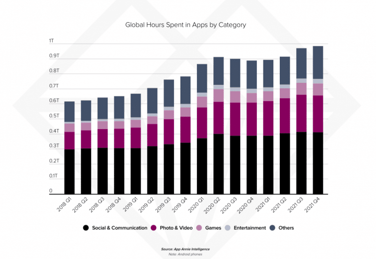 Of the 950 billion hours spent on Android devices in the fourth quarter of 2021, 650 were spent on social & communication and photo & video applications, per the report.