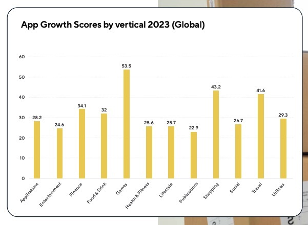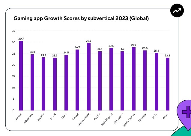 Mobile gaming apps are a dominant force, securing a Growth Score of 30.4 on a global scale. Among the top-performing subverticals are action, hyper-casual, sports, RPG, and casual gaming apps.