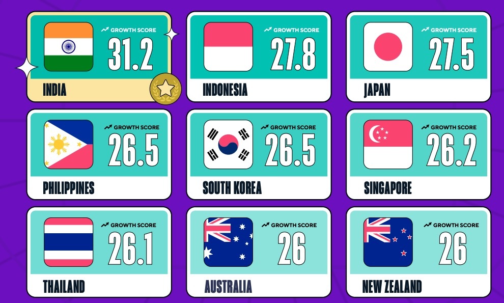 India stands out among individual countries, boasting the highest growth score of 31.2. This remarkable growth can be attributed to the increasing accessibility of affordable smartphones and mobile data plans.