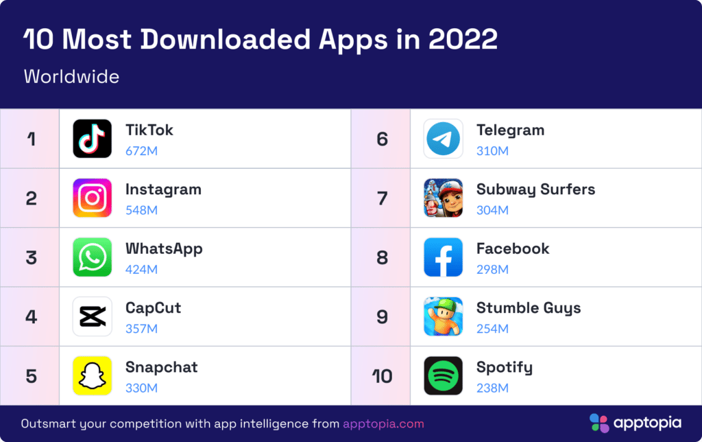 - TikTok became the most downloaded app in 2022, with 672 million new installations worldwide.