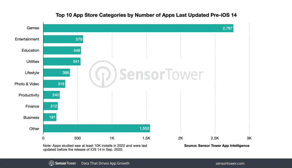 Per the Sensor Tower’s analysis, which studied apps with at least 10,000 downloads in 2022, Apple’s push to remove outdated apps will affect at least 2,966 apps which were updated in 2018 or earlier. That number more than doubles to 7,335 when including apps that were last updated before September 2020, when iOS 14 was released.