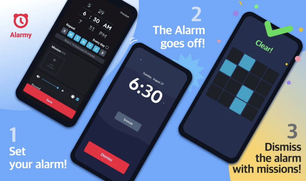 - Customizable Alarms: Set alarms with your own music or choose from Alarmy’s selection of soothing sounds to wake up to.