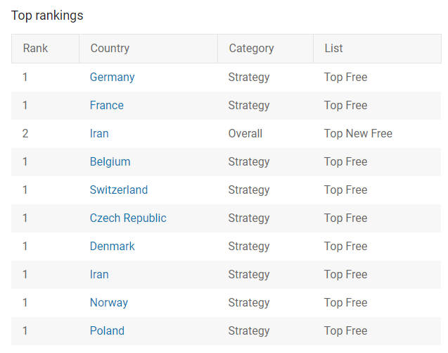 On Google Play Store, Mining Inc. is currently (May 26, 2020) the #1 Free Strategy Game in Germany, France, Iran, Belgium, Switzerland, Czech Republic, Denmark, Norway and Polland. It is also the second app in Iran/Overall.