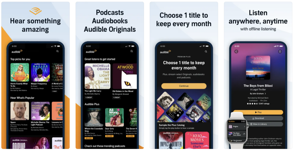 Audible, an Amazon company, offers a vast collection of audiobooks, original content, and podcasts. With features like the Plus Catalog for free access to audiobooks and guided wellness programs, Audible is more than just an audiobook platform. It’s a holistic audio experience for book lovers and seekers of knowledge.