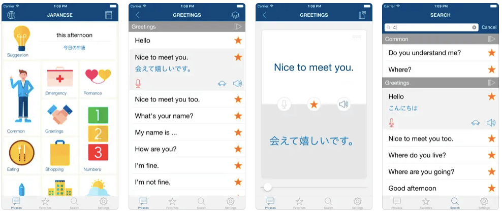 Furthermore, Learn Japanese Phrases comes with features like instant keyword search and customizable font size. Users can record and listen to their voices, and the app works without an internet connection.