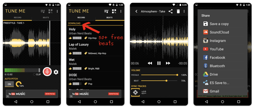 AutoRap by Smule is an app that rap fans will enjoy, and it is one of the best autotune apps. In addition to its original rap beats, the app includes over 5000 beats from top artists such as Cardi B, Post Malone, Drake, Eminem, and Dr.Dre. With just a few taps, users can create amazing Raps. The app includes an extensive library of instrumental rhythms, allowing users to create incredible raps using a variety of beats.