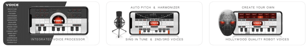 Voice Synth is a professional live sound processor and music synthesizer that is only available for iOS. In-app background sound, VoiceOver, Audio Unit V3, instrument and effects, parameter automation, audio routing, repeater, audio feedback suppression, noise gate manual/auto, tapes to record/export your performance, 250+ factory presets, and includes many more technical features. Voice Synth records four octaves, and the equalizer has 24 bands, and ten presets.