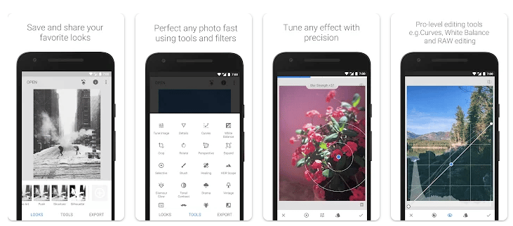 - Advanced Filters and Effects: Snapseed includes a variety of professional-grade filters, such as lens blur, glamor glow, and vintage looks, as well as creative effects that can transform ordinary photos into stunning works of art, perfect for DSLR photographers seeking artistic expression.