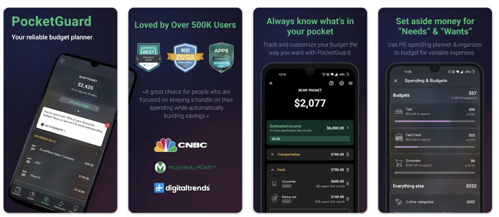 - Automated Expense Tracking: PocketGuard connects to your bank accounts to automatically track your income, spending, and recurring bills, offering real-time updates on where your money is going.