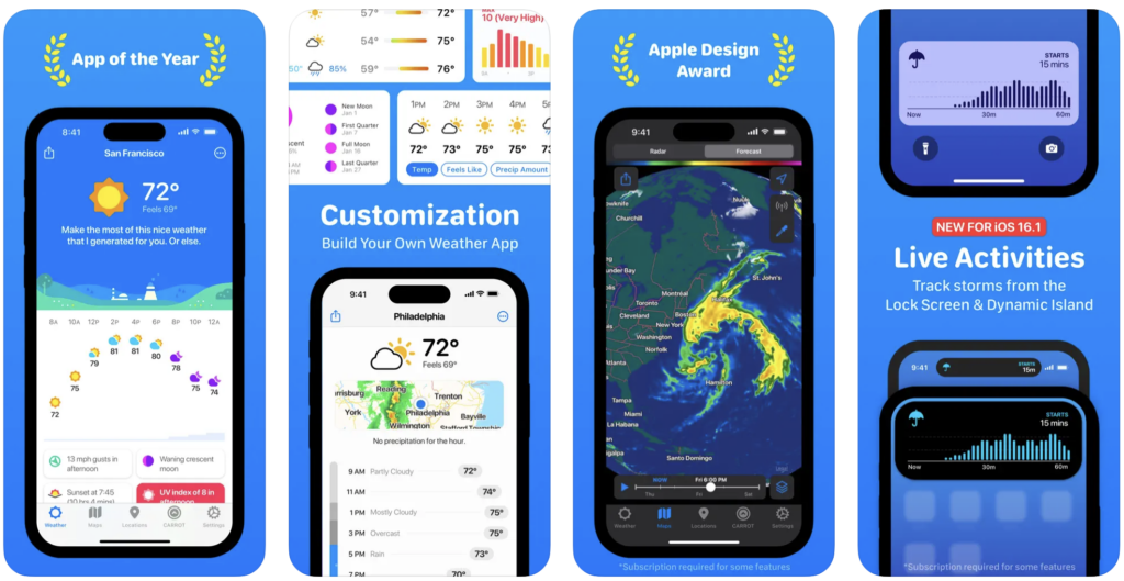 Carrot Weather is an exclusive weather app that users appreciate for its various styles. The app provides users with robots with five distinct personalities, ranging from the strict “professional” to the profanity-laced “extreme.” This app, which feels more like a friend than a weather app, deserves to be ranked among the best free weather apps for iPhone. Carrot Weather provides accurate, up-to-date weather information and notifications on an hourly and daily basis, including precipitation, weather alerts, and lightning strikes. It has an app lock, home screen widgets, and live activities.