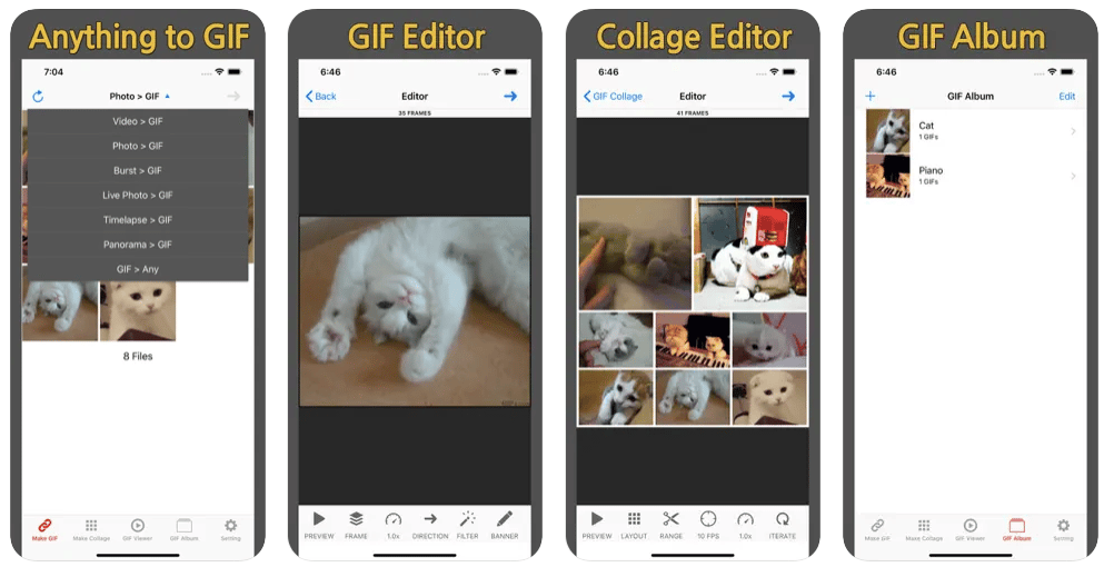 ImgPlay app is just one of the best GIF maker apps to create GIFs using photos and videos. The app allows users to convert any video in their gallery into a gif. You can make a GIF with multiple photos or create a simple slideshow. You can either create a gif from scratch or make existing gifs more interesting with the app’s gif editor. You can change the video speeds from 0.02 seconds to 1 second, and you can adjust the playback direction of the video like a boomerang with the speed control of the app. Also, users can import saved photos, videos, and GIFs from Google Drive or Dropbox and convert them to GIFs directly.