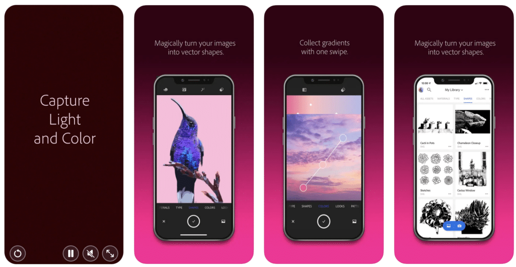 Adobe Capture: Illustrator, Ps is a one-of-a-kind app that collects and provides all graphic design tools in one location. The app lets users create intricate patterns, unusual designs, logos, digital brushes, and more. Adobe Capture: Illustrator, Ps features background removal, vectorization on the fly, color themes, gradient creation, 3D texture creation, light and color capture, and more.
