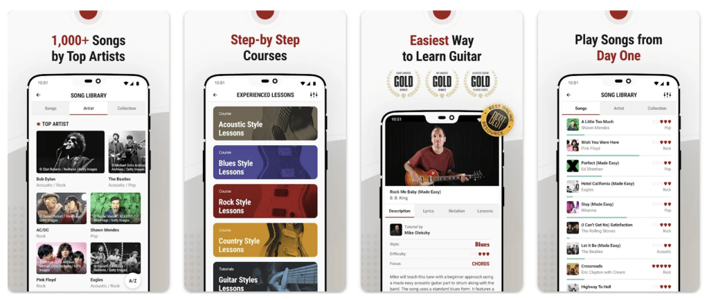 - Genre-Based Learning Paths: Choose from rock, pop, blues, folk, and country, tailoring your learning experience to your musical preferences.