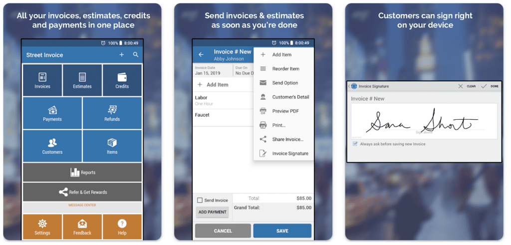 Freshbooks is one of the best invoice apps for Android because it’s simple to use for creating, drawing, sending, and printing invoices. Users can quickly create and share professional invoices with the app. Freshbooks allows you to receive instant payments and accept online payments. The app also keeps track of expenses and revenues and provides automatic payment records.