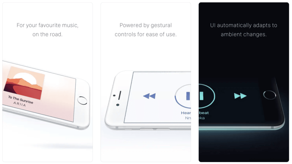 ARIIA is an iOS music player app with a clean interface and design. Unlike other apps, ARIIA is optimized for listening to music on the go. The app detects changes in the environment and adjusts its interface accordingly during daytime and nighttime driving. ARIIA has been designed for gestural interaction, taking into account potentially hazardous road conditions.