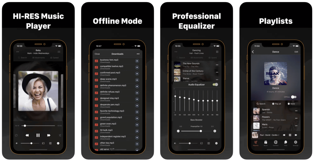 Onkyo HF Player – Hi-Res Music is an app that gives you more control over the sound of your music and deserves to be among the best music players for iPhone. The app includes 16,384 discrete high-definition equalization bands and an adjustable linear-phase FIR equalizer with zero loss of sound quality.
