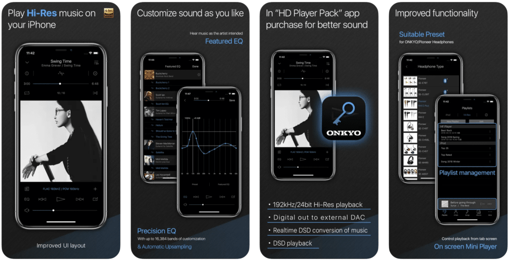 Music lovers can set their own custom EQ presets with the Onkyo HF Player or select optimized filters created by professional musicians. The app has features such as an auto sampling function, interlaced play option, repeat function, shuffle function, album art, and lyrics display. Onkyo HF Player supports MP3/ALAC/AAC/WAV/AIFF formats up to 48 kHz.