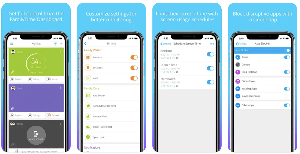 FamilyTime is among the best parental control apps for iPhone. Parents can ensure the safety of their children online and offline with this app. FamilyTime has useful features like app blocking, child tracker, family locator, screen time allowance, content filters, geo-fencing, app restrictions, and much more.