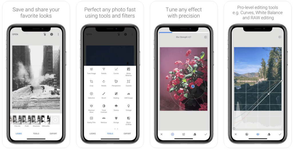 Developed by Google, Snapseed is a professional photo editor and is among the best photo editing apps for iPhone. The app comes with 29 tools and filters like structure, HDR, perspective, and brush. Users will access tips about photography in Snapseed and can use the app in dark theme mode.