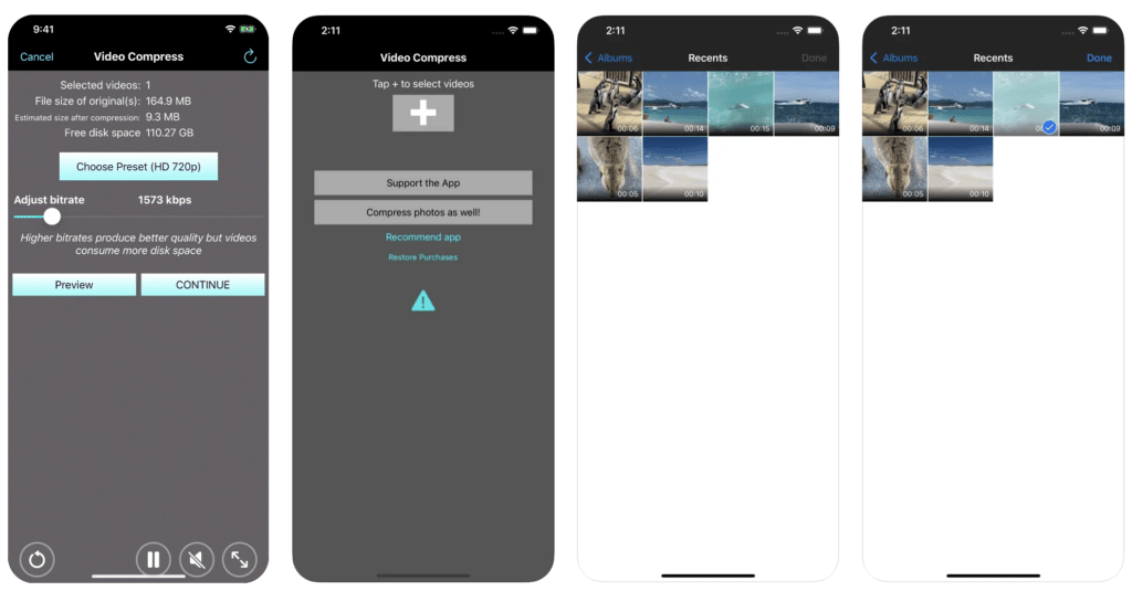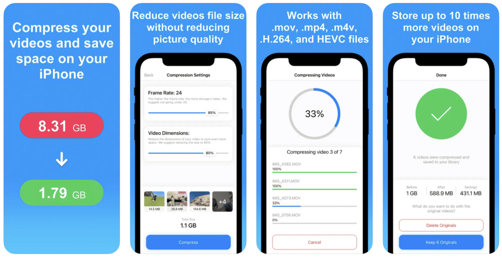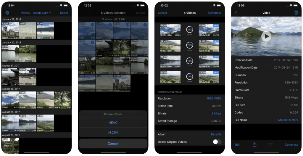 Video Compressor & Editor is an easy-to-use and understandable video compression app. The app allows batch and single video compressions and many other editings such as crop, cut, trim, cut, split, merge and rotate videos. Video Compressor & Editor has 4K, 1080p, 720p, 540p, and 480p resolution options for H.264 compression and 4K, 1080p, and 720p resolution options for HEVC compression. Users can compress 240 FPS video to 240/120/60/30 FPS with the app.