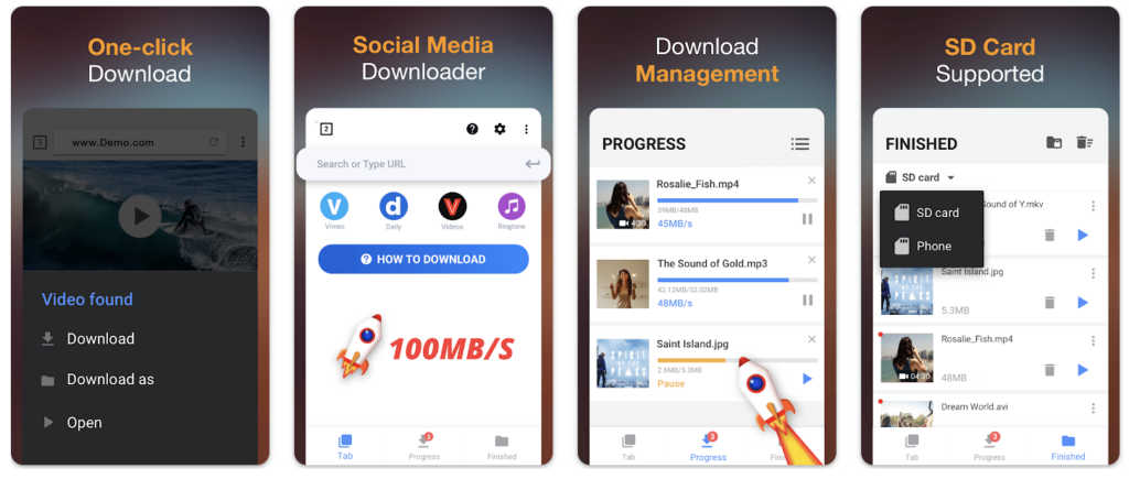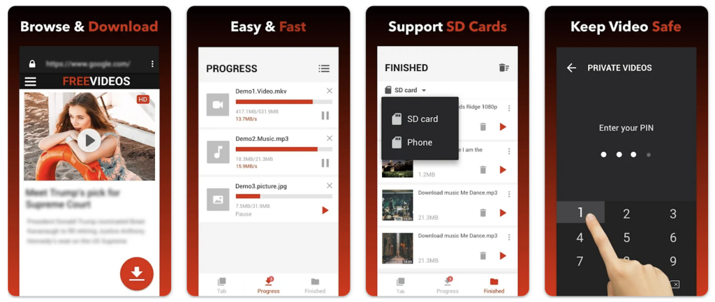 Additional features include a built-in browser, playing videos offline with the built-in player, and saving files in a password-protected folder. With fast download speeds, progress monitoring, and support for large files, Video Downloader – Downloader deserves to be one of the best video downloaders for Android.