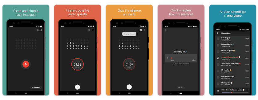 - Skip Silence: Features a skip silence mode to automatically pause recording during silent moments, saving storage space and playback time.