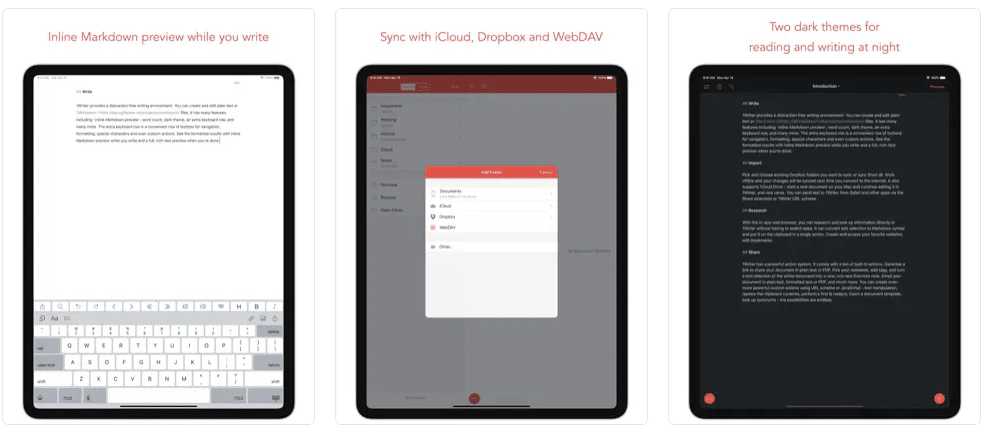 Additionally, the app has two dark themes and 20 different fonts. Writers can shape the app according to their style. Also, 1Writer has Touch ID/Face ID for those who want to create more secure documents.