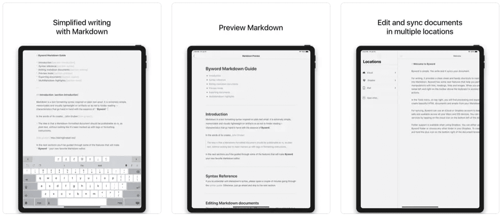 Designed to make it easier to write with Markdown, Byword is among the best writing apps for iPad.Text documents can be synchronized on your Mac, iPhone, and iPad devices by Byword. Documents are always accessible in offline mode. Byword offers an alternative dark theme for extra comfort in low light conditions for writers who write for hours.