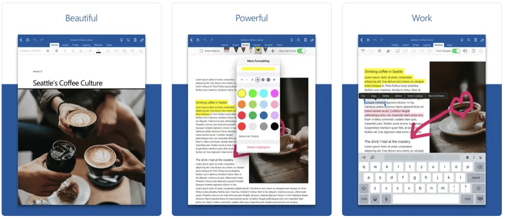 Discover this powerful word processing app from Microsoft on your iPad. Enjoy writing your articles with beautifully designed modern templates. Use the app’s rich formatting and layout options for projects, assignments, novels, letters, blog posts, screenplays, and more. Submitted documents remain intact in their format and layout, and appear as they should on any device.