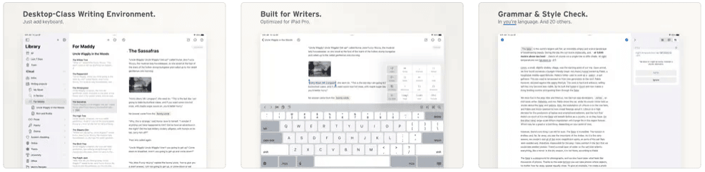 Scrivener is one of the best writing apps for iPad with extensive features, especially for iPad. Specially designed Scrivener allows you to compose your text in the order you want, in large or small sections as you want. Write when inspiration strikes, and Scrivener will guide you! Meticulously outline, identify and reconstruct every detail. The app offers the ability to import Word, RTF, Final Draft, and plain text files and easily divides the imported text into sections.