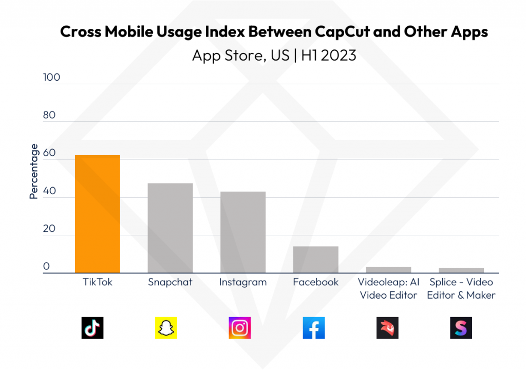 One key factor contributing to CapCut’s success is its seamless integration with TikTok, one of the world’s most popular social media platforms. Users can easily log in to CapCut using their TikTok accounts and effortlessly share their creative content on TikTok and other social media platforms. According to data.ai Intelligence, TikTok has a strong connection with CapCut, with 62% of users using both apps, surpassing Snapchat by 15 points and Instagram by 19 points.