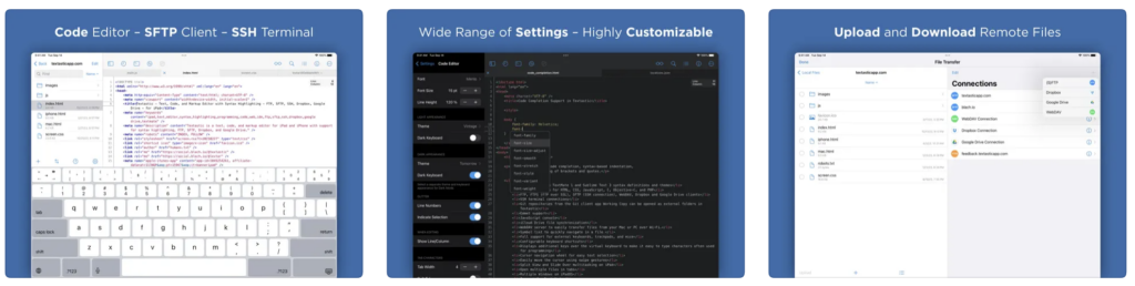 Textastic is a terrific app that is one of the code editors for iPad. Supporting over 80 programming and markup languages, it excels in syntax highlighting and code completion. Seamlessly connect to SFTP, FTP, WebDAV, Dropbox, or Google Drive. The SSH terminal enables direct server interaction. Textastic embraces multitasking with features like Split View and Slide Over, making it an ideal choice for professionals and learners alike.
