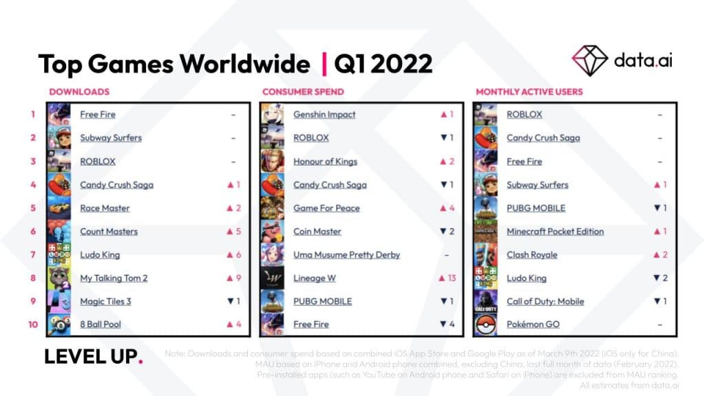 Genshin Impact is set to be the #1 game with the highest consumer spending worldwide in Q1 2022, followed by ROBLOX and Honor of Kings.