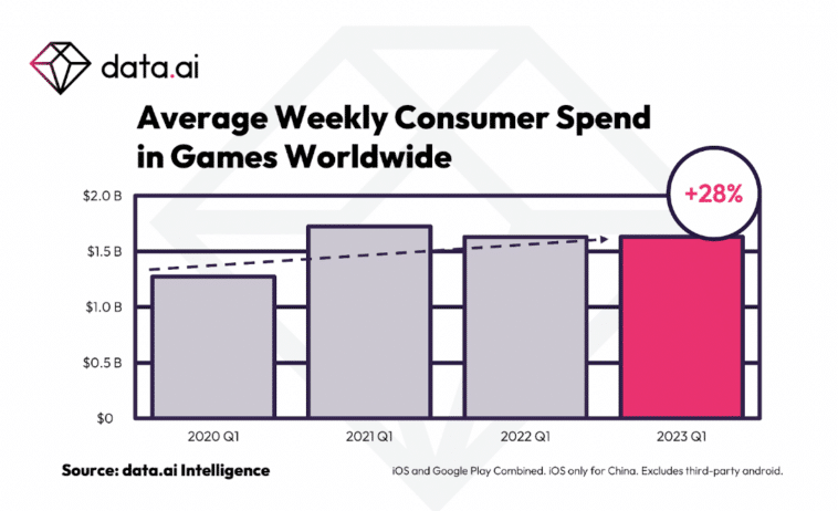 Consumers spent an average of $1.63 billion on mobile games and downloaded 1.2 billion titles each week during the first quarter of 2023, according to a new report from data.ai.