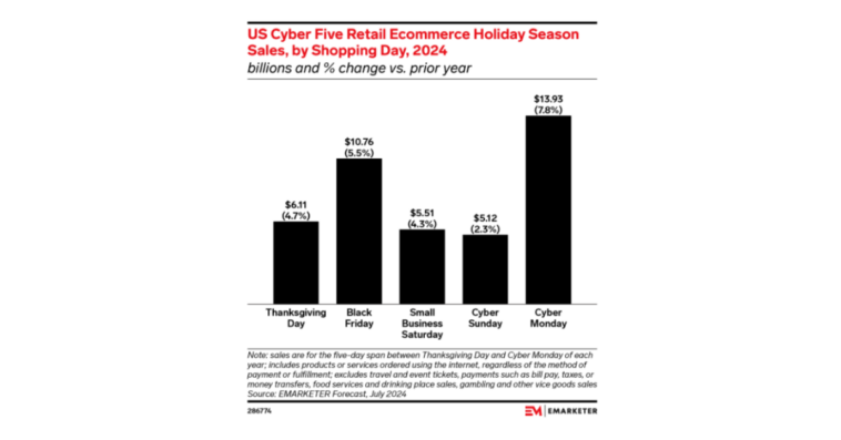 As the holiday shopping season reaches its peak, Cyber Monday once again claims the spotlight as the undisputed leader of the Cyber Five, a period that spans Thanksgiving through the following Monday. According to the latest July 2024 forecast from eMarketer, Cyber Monday is expected to generate an astounding $13.93 billion in US ecommerce sales this year, outperforming any other day in this shopping frenzy. But this surge in consumer activity is just the tip of the iceberg in a season poised to redefine retail success.