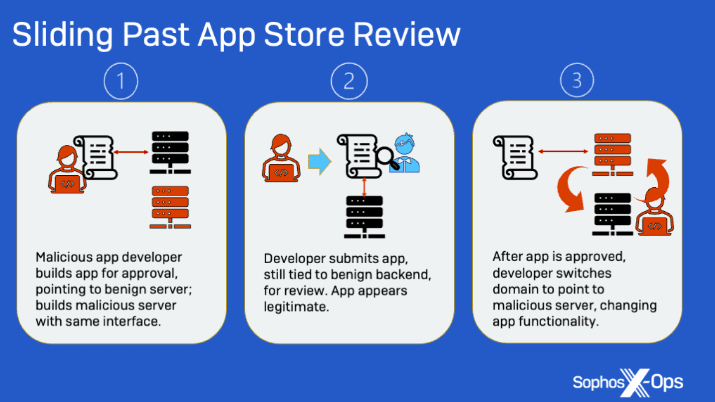 In order to bypass the review process, fraudsters first connected their apps to a benign server before submitting them, and then switched to the malicious server after the approval which enabled them to change the apps’ functionality.