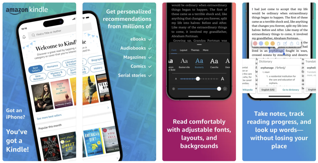 Furthermore, the app allows users to customize their reading experience with adjustable text size, font type, and background colors. Users can look up words, people, and places while they read and easily track their reading progress. With Kindle, you can sync your books across devices and seamlessly switch between reading and listening with Audible integration.