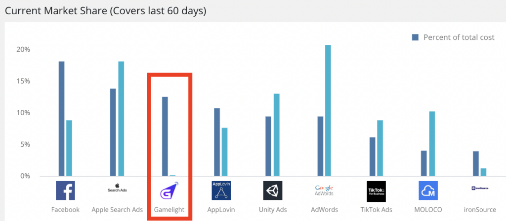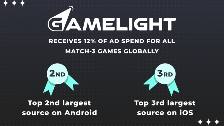 The insights also show that despite currently being active in only 11 countries, Gamelight commands an impressive 12% of global ad spend for all Match-3 games, a remarkable feat in contrast to competitors like Meta, Applovin, TikTok, Google, Unity, ironSource, and Moloco with a larger global presence. In their operational regions, Gamelight claims an even more substantial share, covering 15%-20% of the total Match-3 ad spend.
