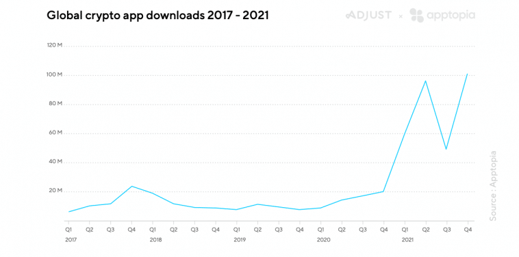 Per the report, crypto apps saw massive user growth globally in 2021 as app downloads surged past 400% YoY. The most notable rise in installs took place in Q4 2021 — a 106% YoY increase following a 49% drop in downloads from Q2 to Q3.