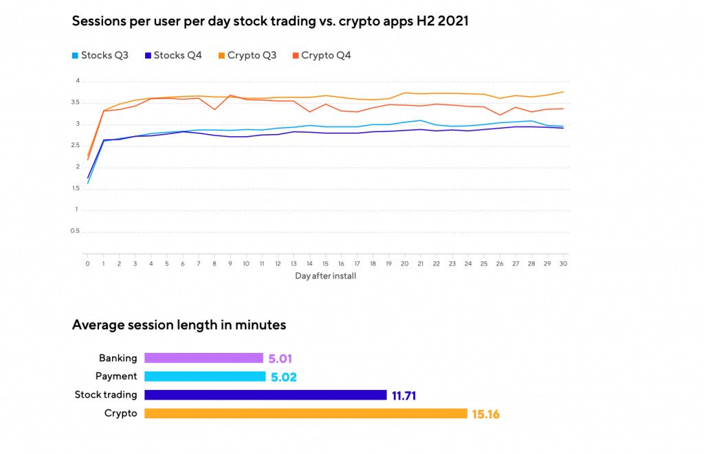 Crypto apps also outperformed stock trading apps on user engagement metrics such as session lengths, sessions per user per day, retention rates, and stickiness, indicating an engaged and high-retention user base for crypto apps.